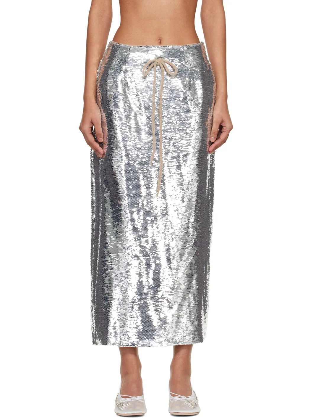 Sequinned mesh midi skirt. · Two-pocket styling · Bow accent at front · Zip closure at back · Central vent at back hem · Full satin lining Supplier color: Silver Body: 100% polyester. Lining: 60% acetate, 40% cupro. Made in Portugal 261405F092001
