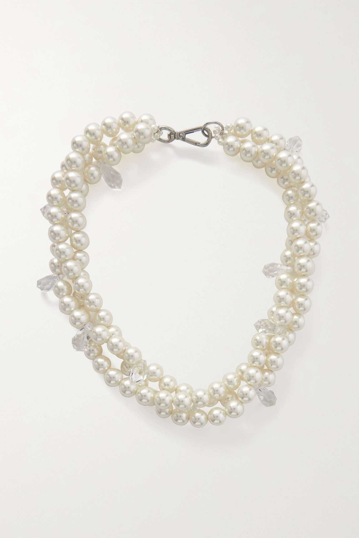 EDITORS'NOTES Pearls have become a signature in Simone Rocha's work - she says she loves to reinterpret them, adding a modern twist. This silver-tone necklace is strung with three rows of faux pearls that are gently twisted to form a chunky silhouette. Wear yours with low or off-the-shoulder necklines to highlight the faceted teardrop crystals. SIZE & FIT This item’s measurements are: - Pendant Length: - 1.7cm - / 0.7in - Pendant Width: - 0.8cm - / 0.3in - Circumference: - 38cm - / 15in - Width: - 2.5cm - / 1in DETAILS & CARE - Lobster clasp fastening - Comes in a presentation box
