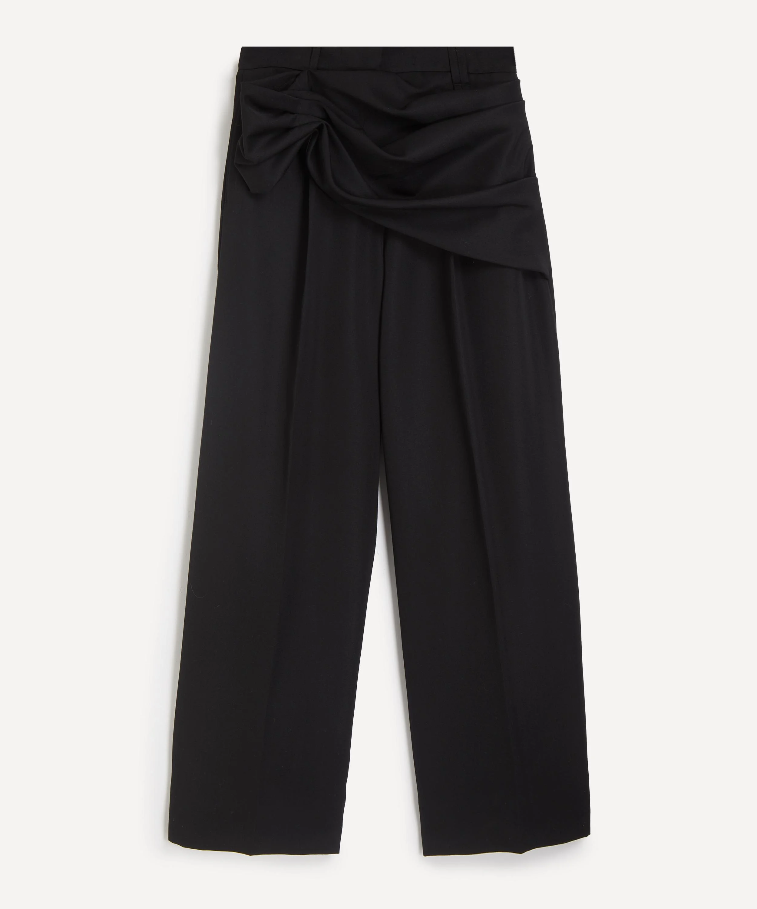 DETAILS Wool trousers High-waisted Wide-leg Long-length Waist sash detail Pleats at the front Cuffed turn-up hem Side seam pockets Rear welt pockets SIZE & FIT Model is 177.5cm/5'10"; Chest: 78cm; Waist: 58cm; Hip: 86cm and wears a size 8 COMPOSITION & CARE 55% Polyester; 45% Virgin wool Lining: 60% Acrylic; 40% Cupro Dry clean
