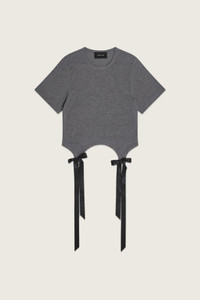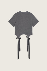 A cropped t-shirt in a soft fine jersey fabrication. Designed for a more fitted silhouette, featuring long satin bow tails at the front. Product Details Fine jersey t-shirt - Satin bow tail accents - Scoop neck and gathered darts - Cropped hem Composition: 100% Lyocell Trim: 100% Polyester SKU: 5223 0571 GREY MARL