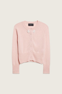 A subtly cropped cardigan knit from a new cashmere yarn, signature pearl cluster embellishments are featured at the front. The model is wearing this style with the Multi Slit Skirt. Product Details Cashmere cardigan - Signature embellishment - Button closure Composition: 100% Cashmere (Excluding Embellishment) SKU: COMK3B 0667 ROSE/PEARL Size & Fit Model is wearing size Small.