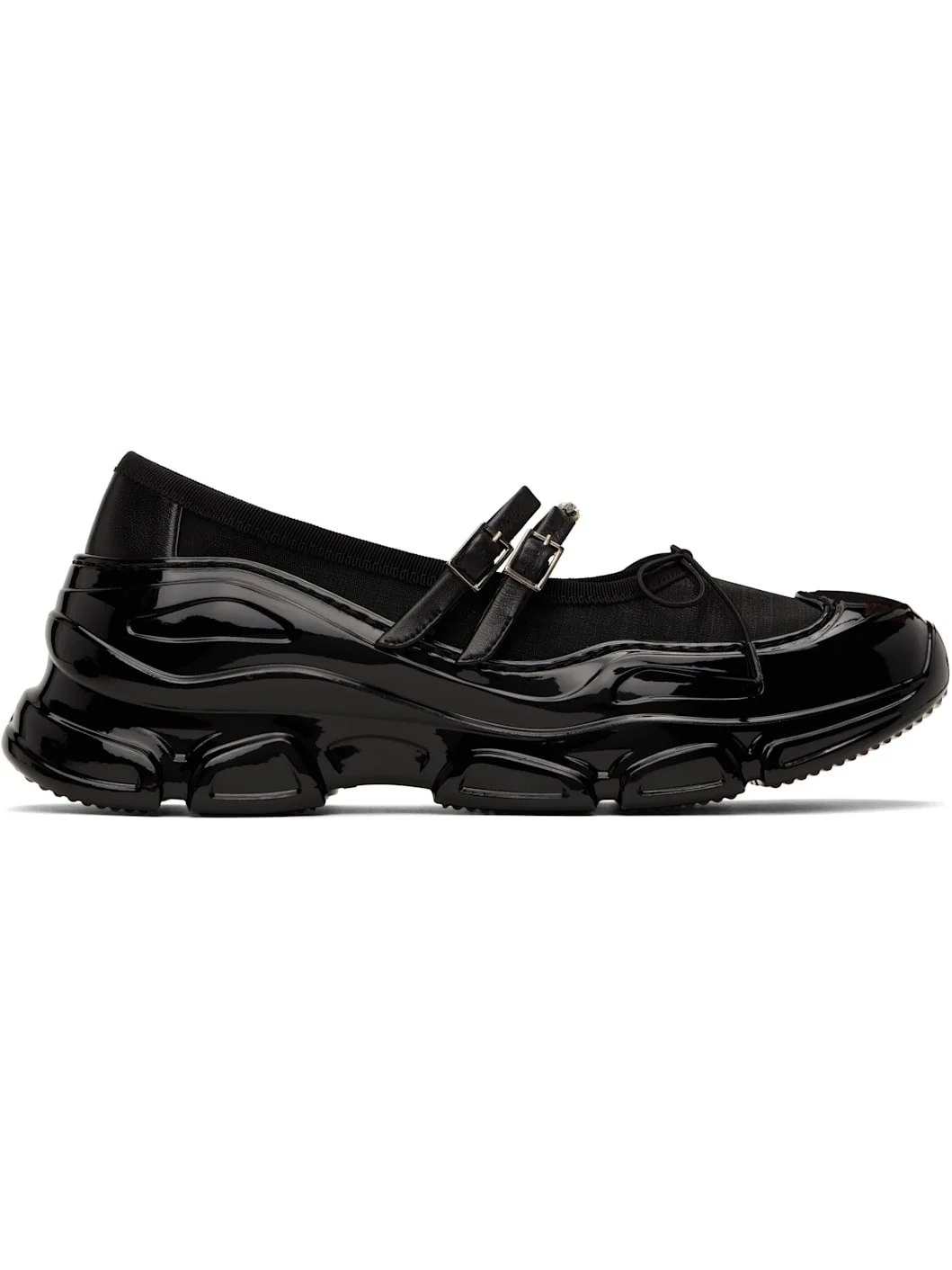 Mesh ballerina flats in black. · Vinyl trim throughout · Bow applique at vamp · Adjustable pin-buckle straps · Crystal-cut and faux-pearl accents at strap · Grosgrain trim at collar · Buffed leather footbed · Sculptural platform midsole · Treaded rubber sole · Platform: H2" Supplier color: Black/Pearl/Clear Upper: textile, synthetic. Lining: rubber. Made in Portugal 251405F128002