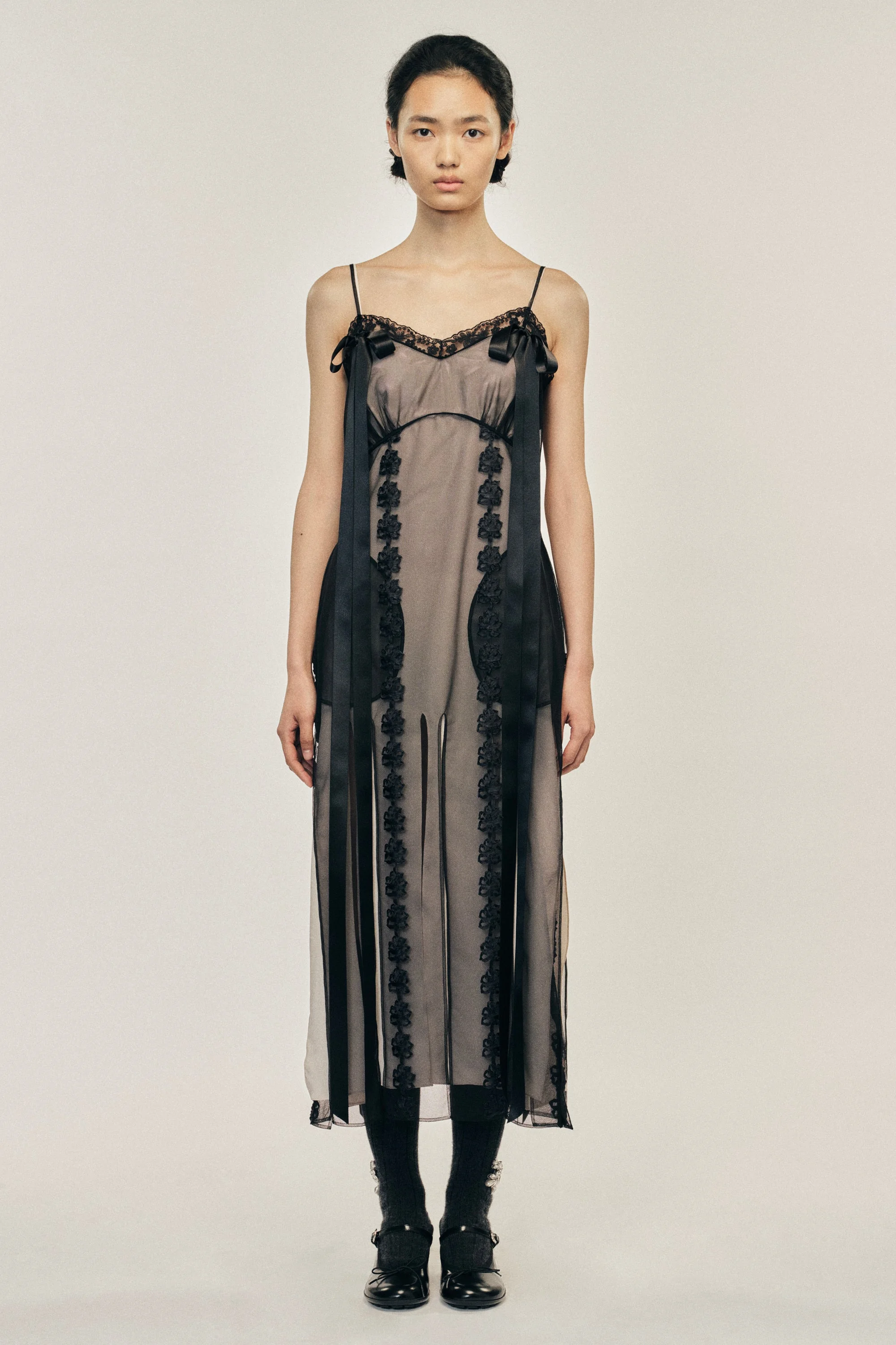 This dress has a semi-transparent construction made of tulle layered with an ethereal crepe de chine base. It takes inspiration from Simone Rocha's classic slip dress silhouette but updated with seasonal motifs like the daisy ribbon chain and slit details. Product Details Layered tulle and crepe de chine slip dress - From Look 13 on the runway - Ribbon applique at front - Seasonal slit detail - Zip closure - Slim fit Composition: 100% Nylon Ribbon:100% Polyester Lining: 73% Acetate 27% Silk Trim: 100% Nylon SKU: 7435 1276 BLACK/NUDE Size & Fit Model is wearing size 6.