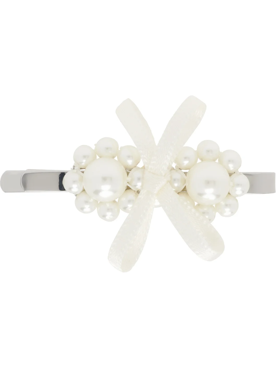 Hair clip in silver-tone brass. · Beaded faux-pearl accents and satin bow at face · Logo engraved at back face · H0.5" x W2" Supplier color: Pearl Brass, resin, textile. Made in Portugal 252405F018007