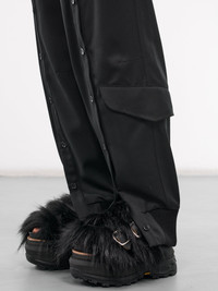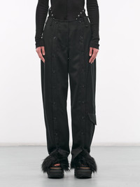 SIMONE ROCHA pants in black, poly-wool blend, paneled construction, belt loops, front concealed zip fly closure, side pockets, back flap pockets, front buttoned placket detailing, side flap pocket, tapered leg, loose fit. Made in Portugal Outer 1: 55% Polyester 45% Virgin Wool Rib: 100% Wool Inner: 60% Acetate 40% Cupro UK Sizing Model is 5'9" wearing size 8. Bust: 30" Waist: 23" Hips: 35"