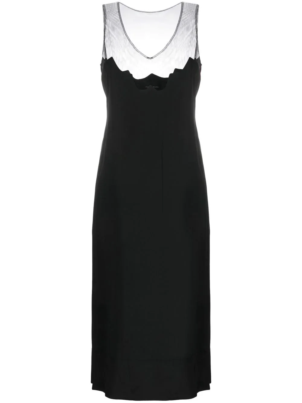 sleeveless midi dress Simone Rocha adds a contemporary aesthetic to this mid-length dress for AW22. This V-neck silhouette is complemented by mesh detailing that adds an intriguing element to this modern design. Imported Composition Outer: Acetate 73%, Silk 27% Lining: Cupro 100% SIZE & FIT Model measurements Height 5 ft 10 in(1.79 m) Bust/Chest 31.49 in(80 cm) Hips 35.03 in(89 cm) Waist 23.62 in(60 cm) FittingInformation This piece fits true to size. We recommend you get your regular size Cut for a loose fit. Comes with an adjustable belt for a flexible fit at the waist Made with a mid-weight non-stretch fabric Washing instructions Dry Clean Only