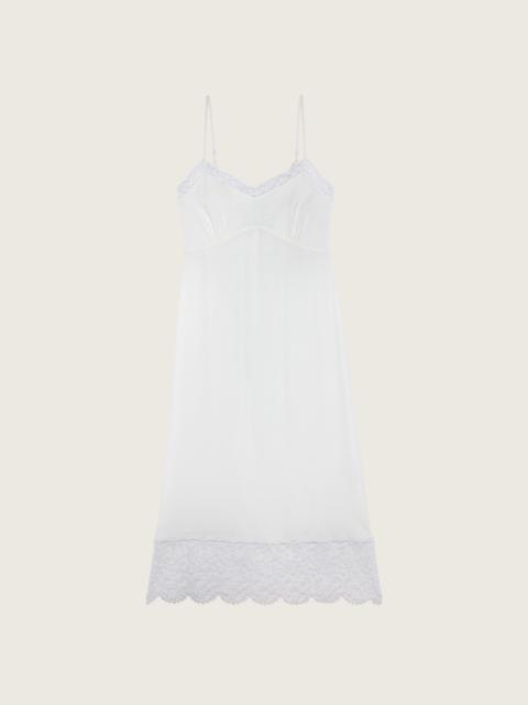 A slip dress made in a silk mix crepe de chine, a classic style from the brand. Featuring a seasonal floral embroidered lace trim and adjustable straps, the perfect layering piece to be worn under our tulle dresses. Product Details Silk mix crepe de chine slip dress - Sweetheart neckline - Floral embroidered lace trim - Adjustable shoulder straps - Gathered bust Composition: Self: 73% Acetate 27% Silk Trims: 100% Nylon Thread: 100%Viscose SKU: 7210 0514 NUDE Size & Fit Model is wearing UK 6.