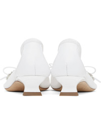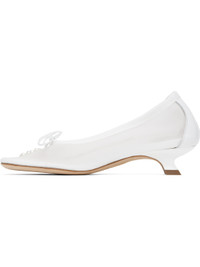 Mesh heels in white. · Square toe · Faux-pearl and crystal-cut accents at vamp · Grosgrain trim and bow accent at collar · Covered kitten heel with rubber injection · Leather sole · Heel: H1.25" Part of the exclusive SSENSE Bridal capsule. Supplier color: Ivory/Pearl/Clear Upper: textile. Sole: leather, rubber. Made in Portugal 252405F122000