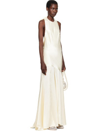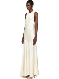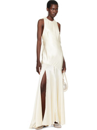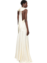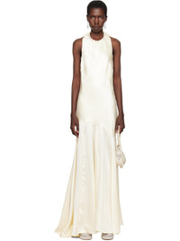 Silk satin maxi dress. · Faux-pearls and crystal-cut accents at round neck · Asymmetric hem · Slit at side seam · Bow accent and hook-eye fastening at back collar · Low back · Partial viscose satin lining Part of the exclusive SSENSE Bridal capsule. Supplier color: Ivory/Pearl/Clear Body: 100% silk. Lining: 100% viscose. Made in Portugal 252405F055000