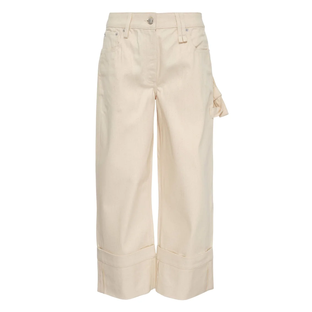 600081495OWT006 / 4189 1309/00/ECRU - Premium cotton denim construction - Straight leg silhouette - Signature bow loop detail on thigh - Wide cuffed hems - High-rise waist - Classic five-pocket styling - Button fly closure - Relaxed fit through leg Simone Rocha Straight Leg Bow Loop Jeans deliver romantic femininity with contemporary denim construction. Crafted from premium cotton denim in soft cream, featuring the designer's signature bow detail and cuffed hem styling. The straight-leg silhouette and whimsical bow accent create a unique piece that balances structured tailoring with playful design elements.