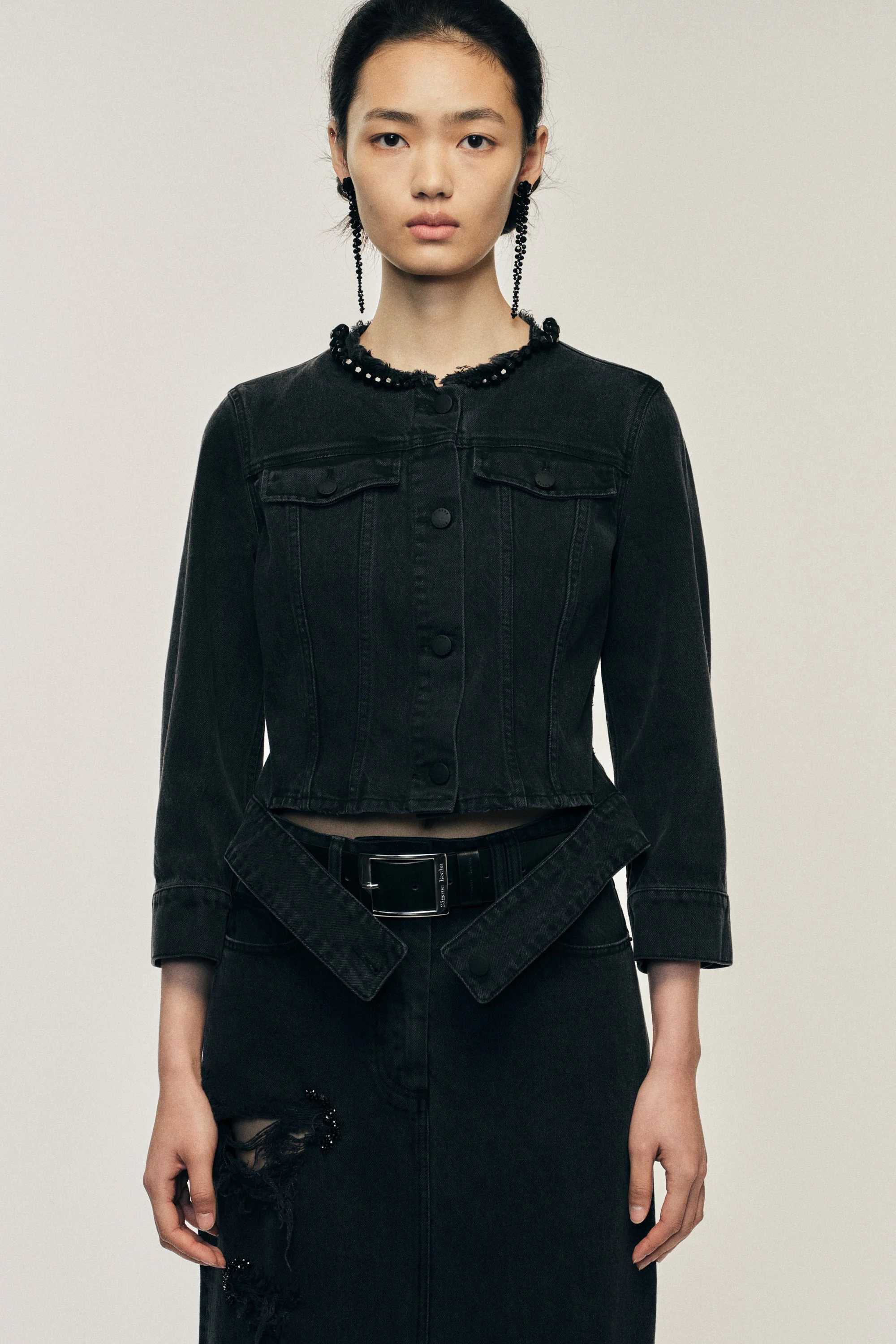 This denim jacket features a tailored, cropped silhouette with a collarless neckline adorned with pearls. It also features a semi-detachable hem for a deconstructed look. The model is wearing this style with the Embellished Kick Back Flare Skirt. Due to the nature of the wash and finishing each piece is unique, no two are exactly alike. Product Details Distressed cotton denim jacket - Signature embellishment - Detachable hem detail - Beaded label at back - Flap and side pockets - Button closure - Slim fit Composition: 100% Cotton (Excluding Embellishment) SKU: 6135B 1239D DISTRESSED BLACK/JET Size & Fit Model is wearing size 6.