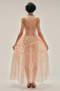 An enduring silhouette from the collection, composed of a fitted bodice and exaggerated hoop skirt. Sheer floral-printed organza reveals the sculpted crinoline beneath, a fuzzy chenille bow cord adds a playful detail at the waist. Product Details Sheer organza dress - From Look 54 on the runway - Seasonal chenille bow detail - Boning construction - Back zip closure Composition: SELF: 100%PL LINING: 61%PES 39%NY UNDER SKIRT: 100% PA RIBBON: 100%CO BONING: 100% PES SKU: 7454HE 1297 NUDE FLORAL/TAUPE