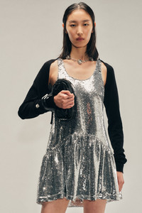 Mini tank dress encrusted in silver sequins, featuring a gathered peplum hem at the waist. Rear darts taper the silhouette, capturing the collection's youthful spirit with a sculpted finish. Product Details Sleeveless sequin dress - Scoop neckline - Peplum hem detail - Back zip closure Composition: SELF: BASE: 100%PES SEQUINS: 100%PET LINING: 60%AC 40%CU SKU: 7474 1300 SILVER