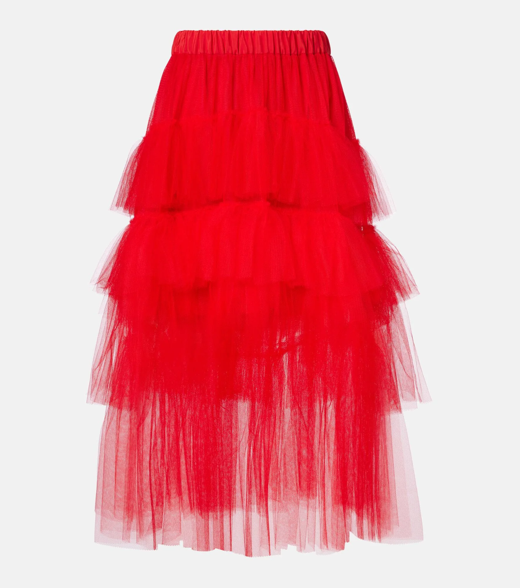 A mainstay at London Fashion Week, Simone Rocha's artful aesthetic is a subversive take on romance. Case in point, this whimsical skirt is cut from airy tulle into a tiered, midi silhouette. Product Details - Material: 100% nylon - Care instructions: dry clean - Made in Portugal - Designer color name: 00000 - Item color: red - Material II: 100% polyamide - Material III: 73% acetate, 27% silk - Lining: 60% acetate, 40% cupro - Elasticated waistband - Item number: P01112218 Size & Fit - True to size - Elasticated waist - Non-stretchy fabric - The model seen in the picture is 178cm-5'10" and wearing a size UK 8