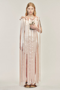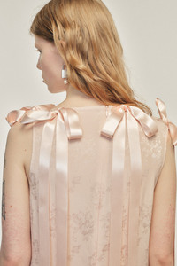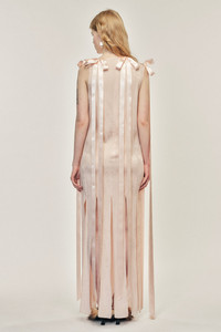 The base of this tonal dress is made from a floral jacquard, the slits along the hem as well as the ribbons from the top create an ethereal quality, allowing it for movement. Ribbons are gathered with small bows at the neckline to form a subtle ruffle detail. Product Details Silk jacquard maxi dress - From Look 53 on the runway - Bow detail at shoulder - Tonal floral detail - Seasonal slit detail - Slim fit Composition: 78% Acetate 22% Silk Ribbon: 100% Polyester SKU: 7423 1254 BLUSH Size & Fit Model is wearing size 6.