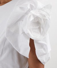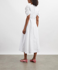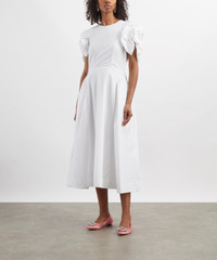 DETAILS Cotton poplin dress Fits true to size Midi length Puffed petal sleeves with rosette appliques Round neckline Fitted bodice Bustle skirt Zip closure SIZE & FIT Model is 178cm/5'10"; Chest: 77cm; Waist: 65cm; Hip: 92cm and wears a size 8 COMPOSITION & CARE 100% Cotton Dry clean