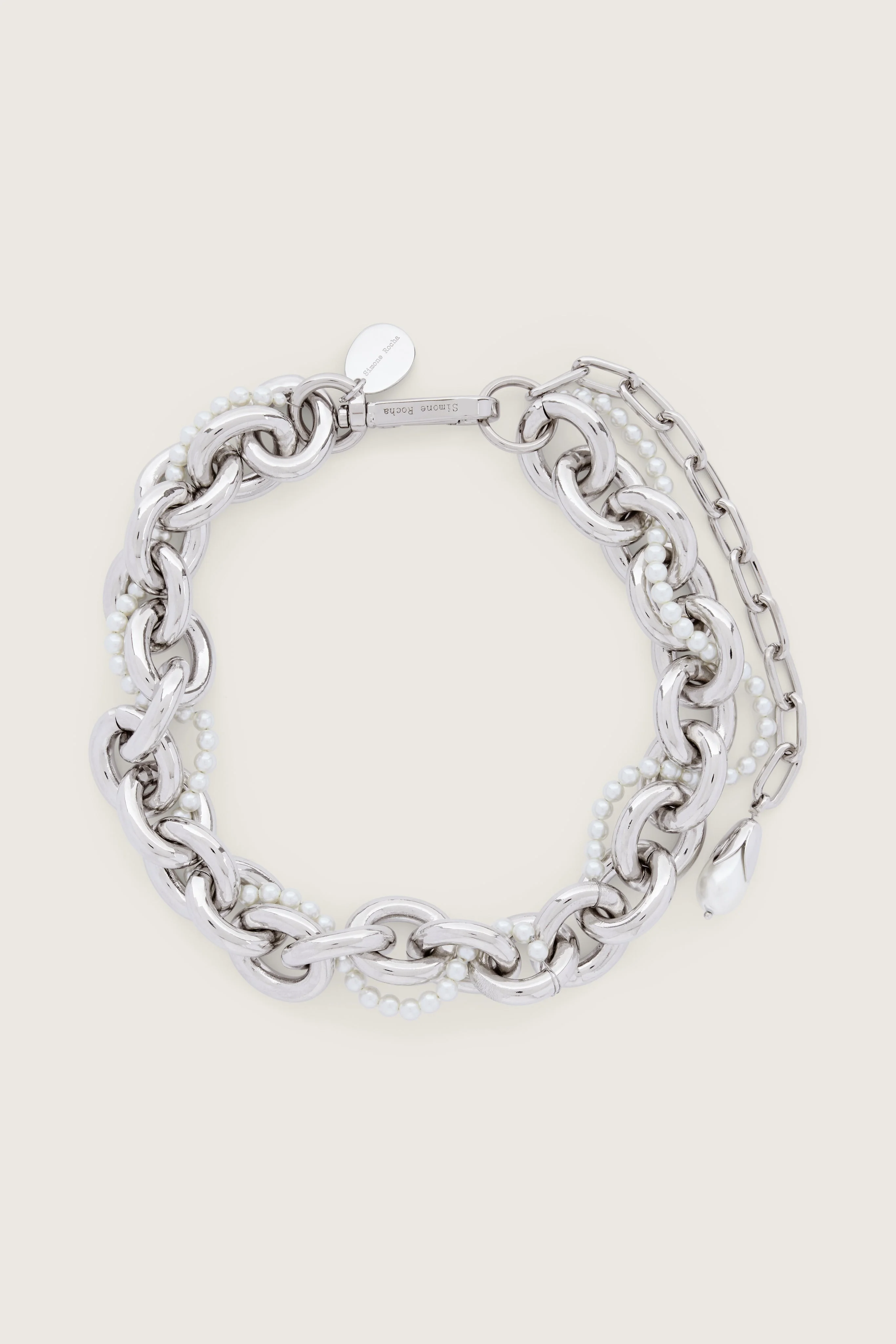 A classic pearl necklace reimagined as a strand of faux pearls are interlaced through chains for a distinctive design. The closure has a extender for length adjustments. Product Details Rhodium and faux pearl necklace - Flower shaped charm - Lobster clasp closure Composition: 75% Brass 25% Faux Pearl (Resin) SKU: NKS94 0904 PEARL/RHODIUM