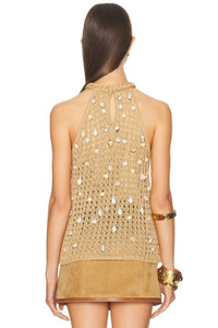 Details - Self 1: 65% polyester, 35% cotton - Self 2: 100% acrylic - Hand wash - Back hook and eye clasp closure with keyhole design - Crochet knit fabric with seashell accents throughout - Made in China - Our Style No. SIMF-WS74 - Manufacturer Style No. W7274-4139