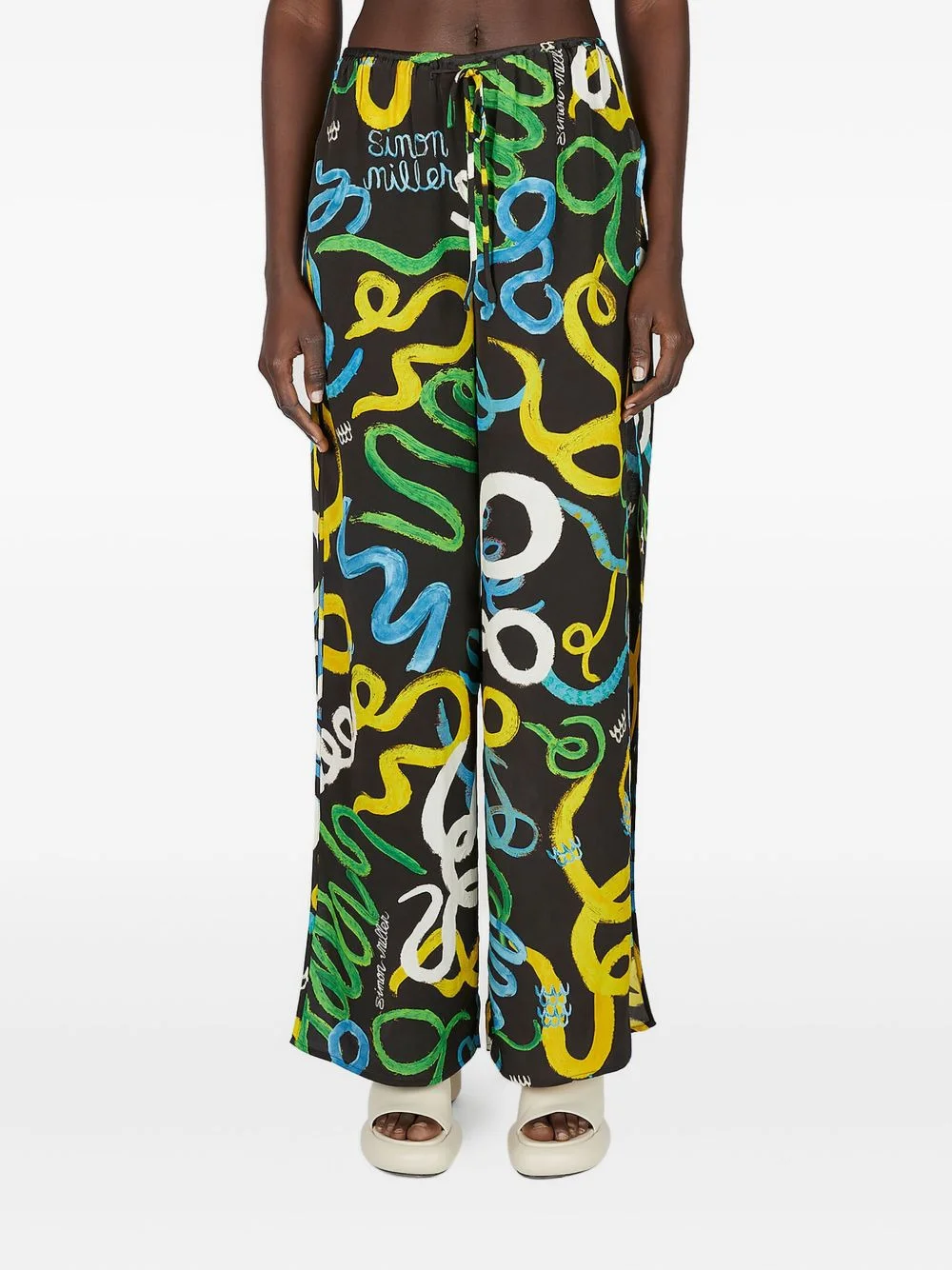 drawstring side-split trousers Highlights - Black - Abstract print - Drawstring fastening - Side splits - High waist Imported Composition Viscose 54%, Rayon 46% Washing instructions Read Manufacturer Guidelines