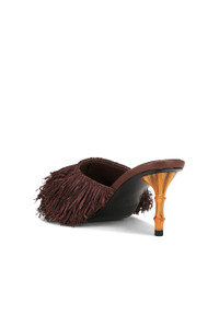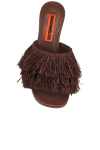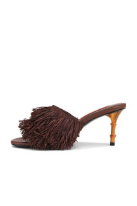 - Raffia upper with manmade sole - Slip-on styling - Faux leather footbed and lining - Fringed raffia design - Rounded square toe with bamboo style heel - Approx 57mm/ 2.25 inch heel - Revolve Style No. SIMO-WZ68 - Manufacturer Style No. F311-9258