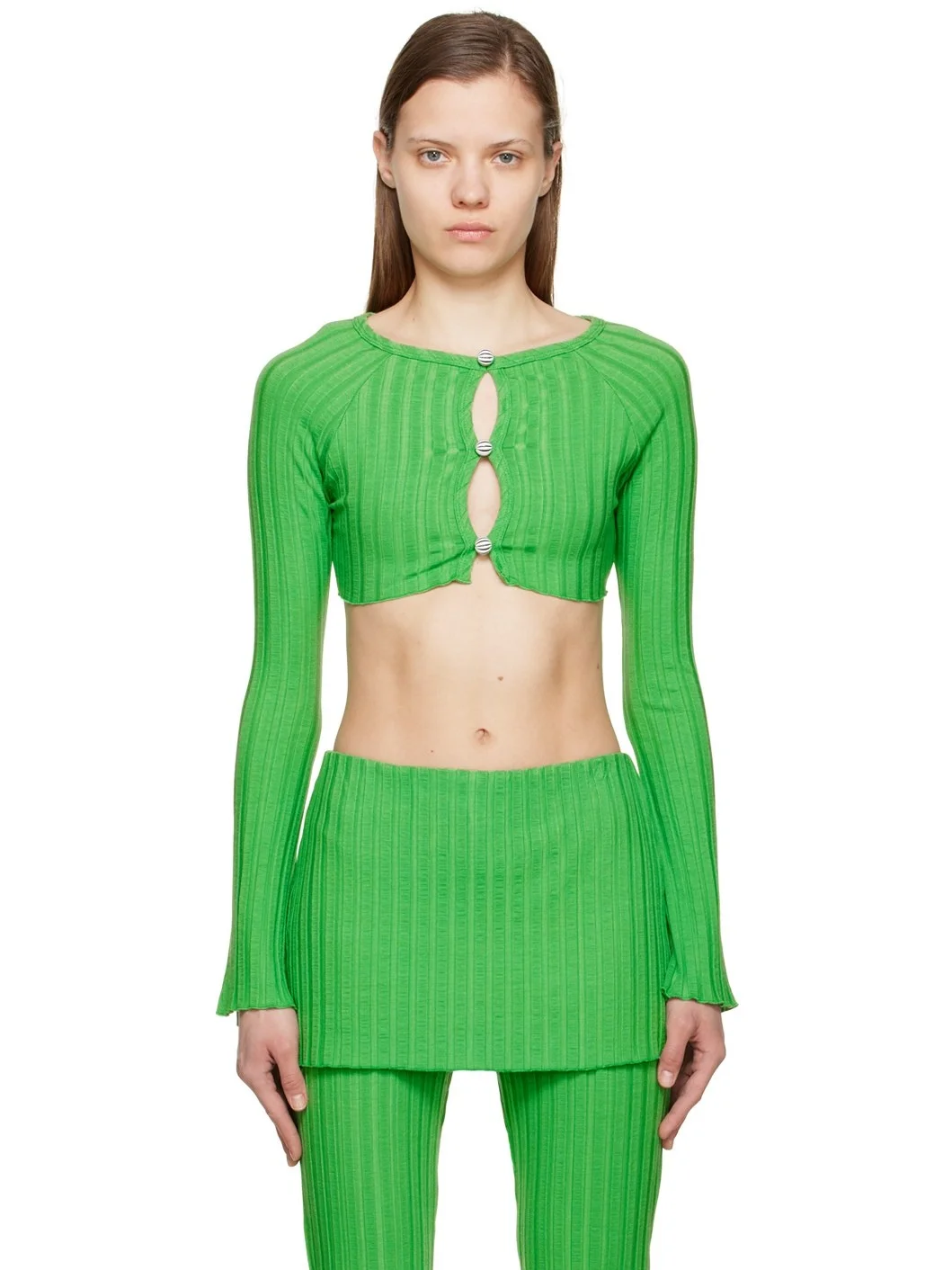 Stretch rib knit viscose cardigan. · Boat neck · Button closure · Lettuce edge at hem and cuffs · Raglan sleeves Supplier color: Grass green 92% viscose, 8% spandex. Made in United States 231708F061000