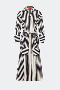 Maxi shirt dress in breathable stretch poplin featuring contrast black and white stripes. Designed with a fitted bodice, full skirt, and adjustable tie waist for a customizable fit. Color: black/white stripe DETAILS Model: W4579-3170-96470 75% COTTON / 22% NYLON / 3% SPANDEX Imported DRY CLEAN FOR BEST RESULTS SIZING TRUE TO SIZE