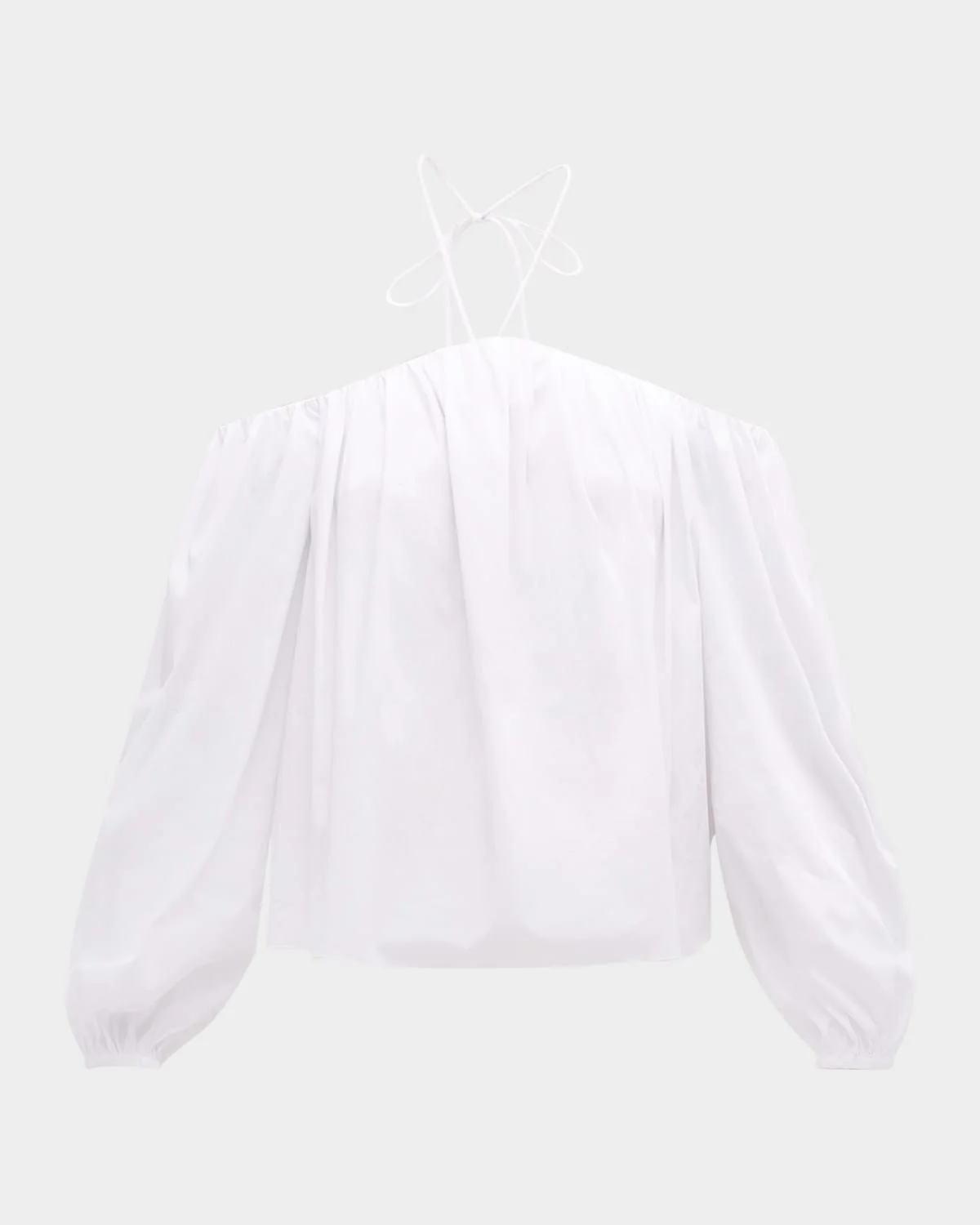 SIMONMILLER "Oleander" poplin top features halter tie straps Offtheshoulder neckline Long puff sleeves Elastic cuffs Hip length Relaxed fit Pullover style Cotton/nylon/spandex Machine wash Imported