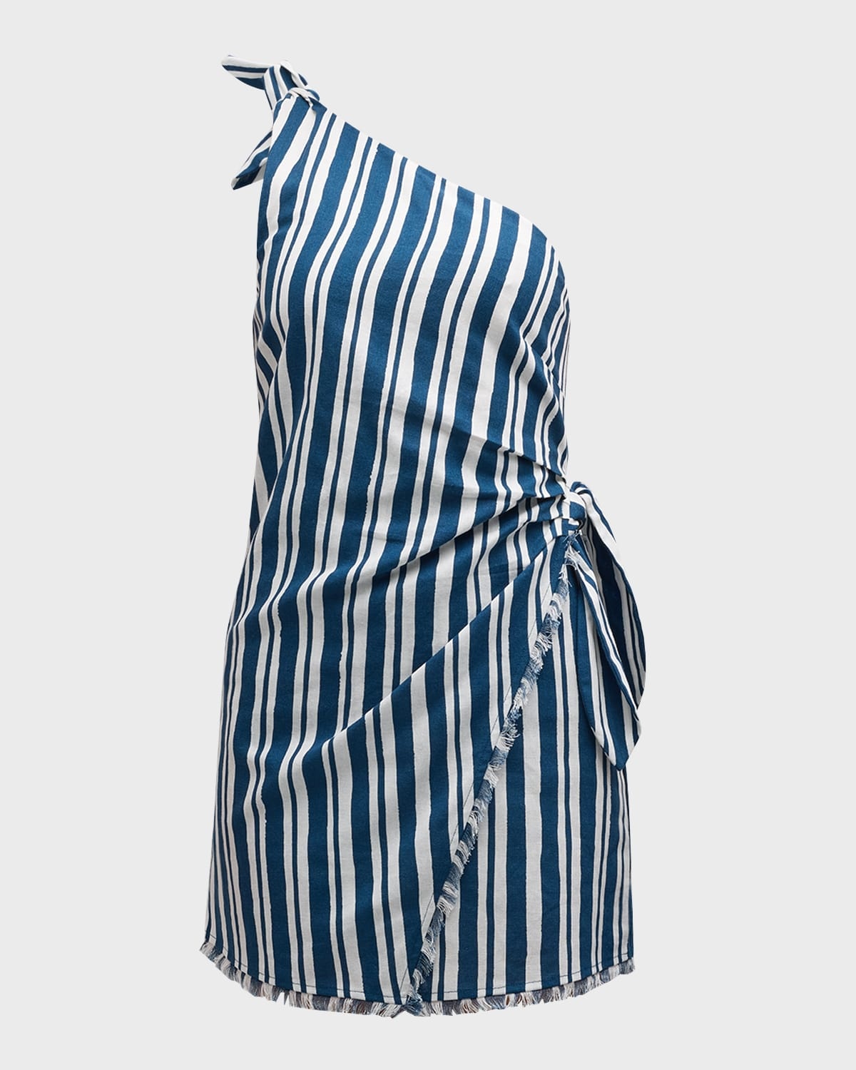 • SIMONMILLER "Ren" lightweight striped mini dress with side-tie closure • One-shoulder neckline • Sleeveless • Hem falls above the knee • Wrap silhouette • Linen/cotton • Dry clean only • Imported Model is 5'10"/177cm. Online Inquiries: NMS21_T5KTK Store Inquiries: #4742997