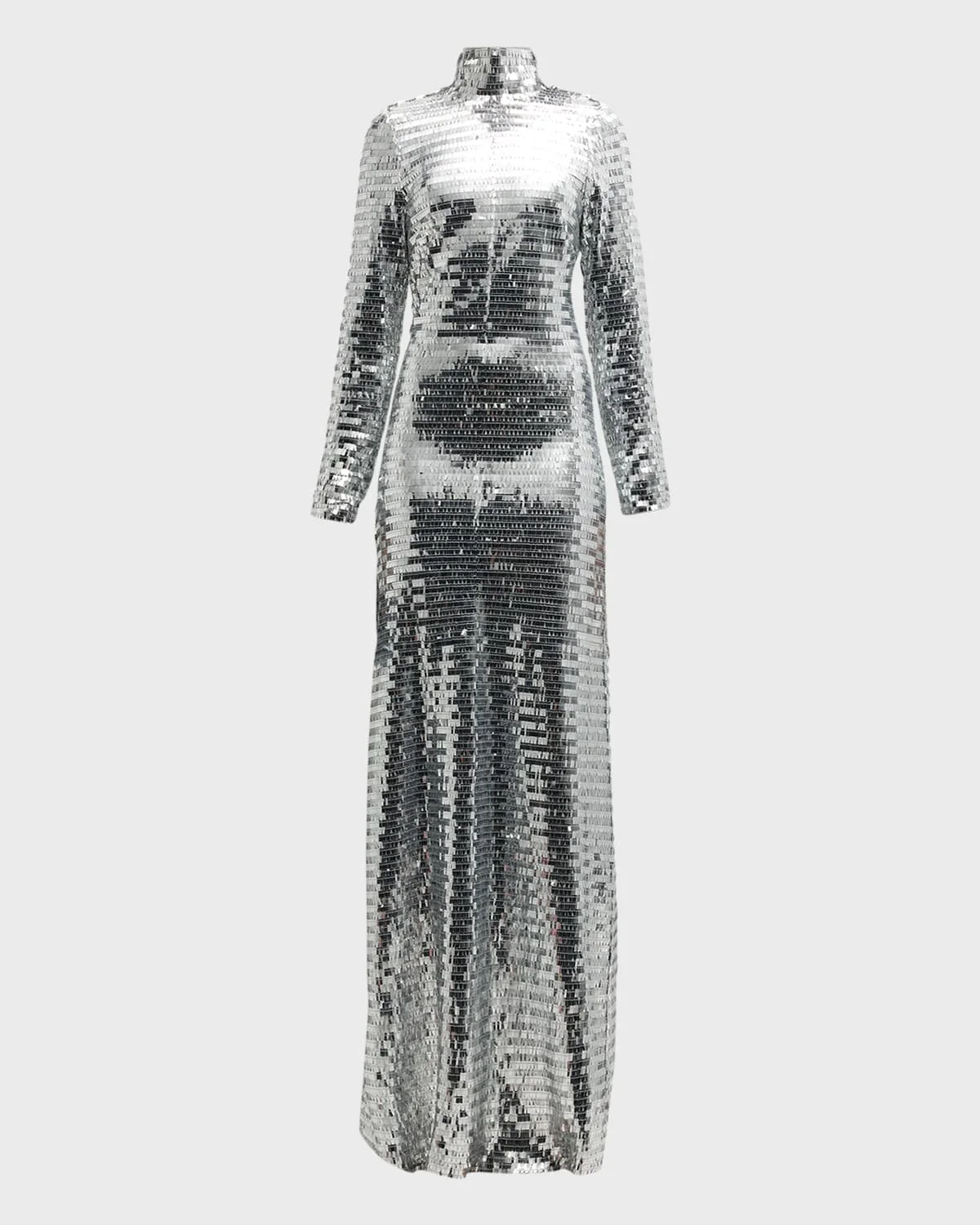 Simon Miller sculpted party dress coated in rectangular micro sequins Approx. 62"L from shoulder to hem Turtleneck Long sleeves Fluted silhouette Floorlength hem Hidden backzip closure Polyester Imported