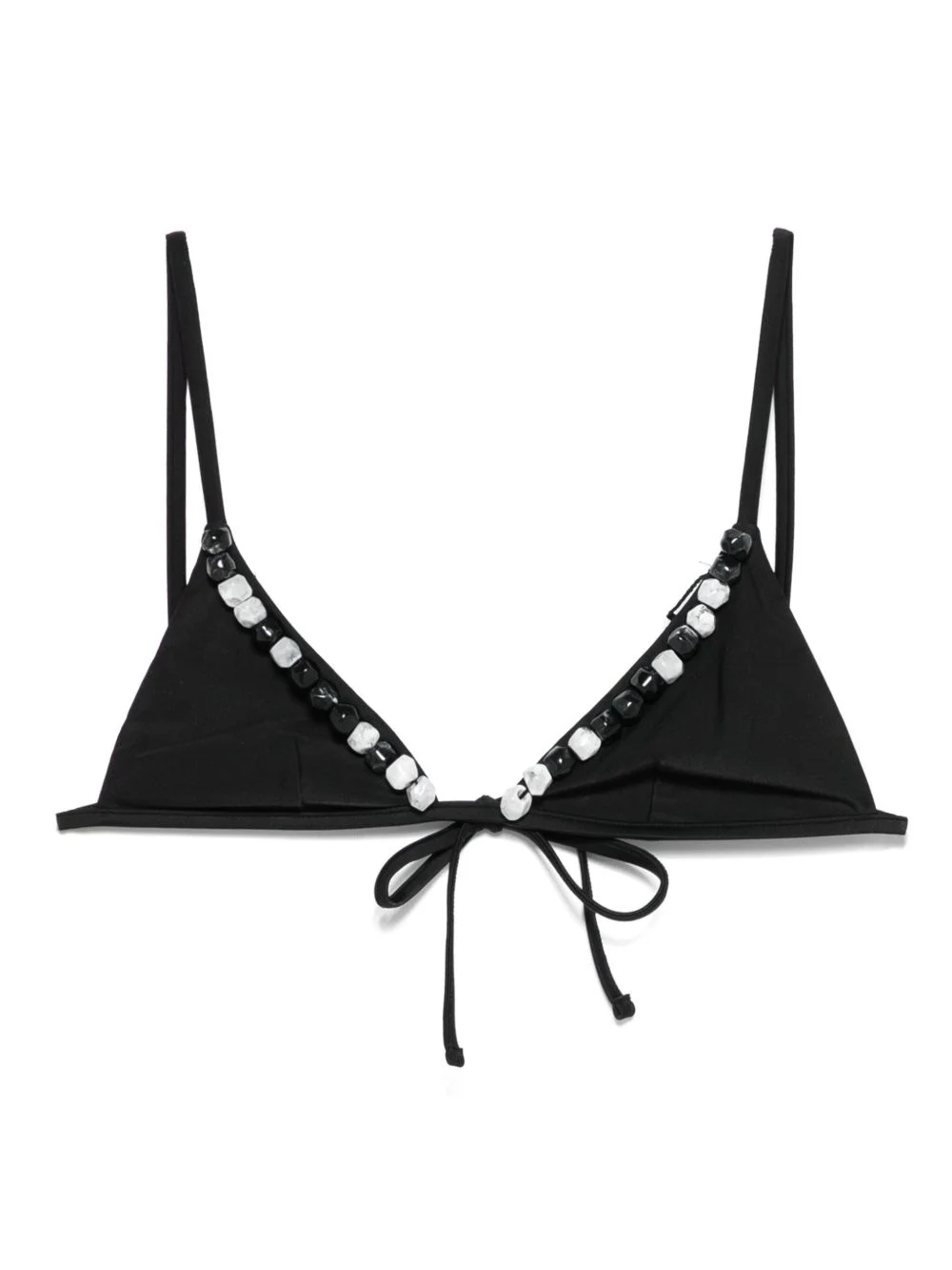 Baci bikini top Highlights - Black - Rear tie fastening - Triangle cup - Bead embellishment - Be mindful to try on swimwear over your own garments. Imported Composition Outer: Resin 100%, Nylon 76%, Spandex/Elastane 24% Lining: Nylon 74%, Spandex/Elastane 26% Washing instructions Hand Wash