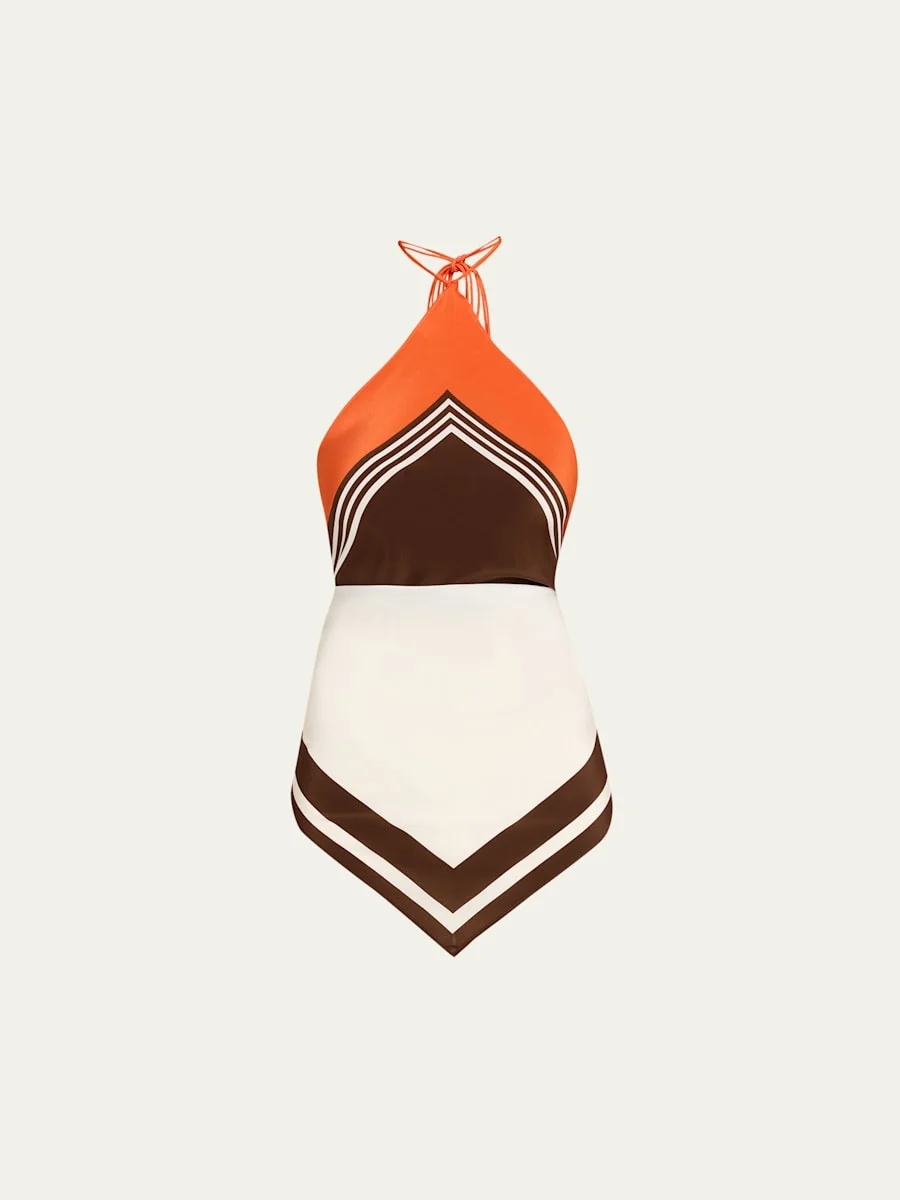 Crafted from lightweight satin fabric, the "Destino" scarf top by SIR features a bold, colorblock design and selfties for endless versatility Halter neckline; selfties behind the neck Sleeveless Open back Midback selfties Silk Imported