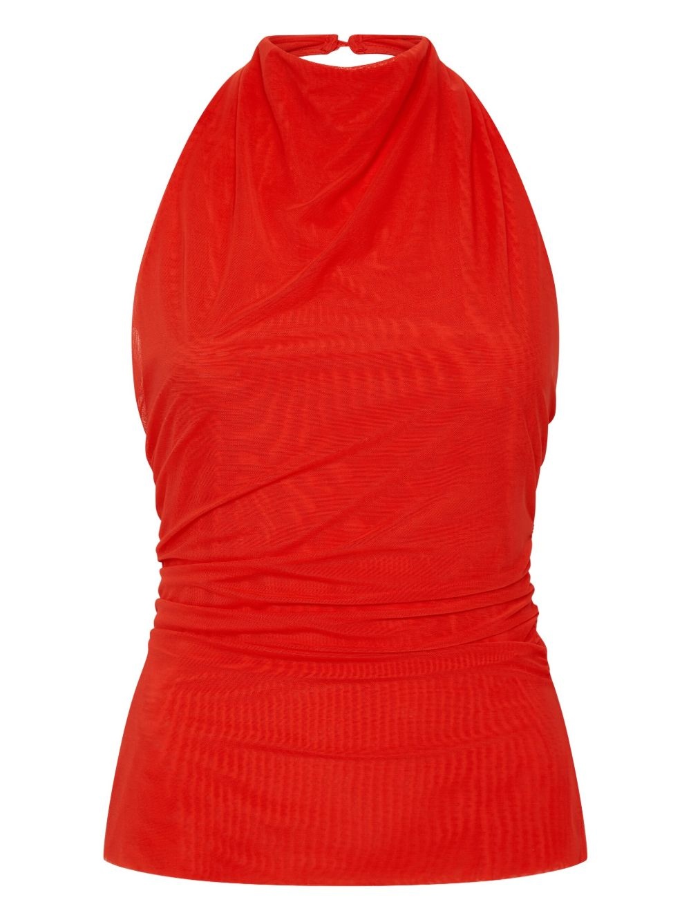 draped sleeveless top Highlights - Bright red - Rear button fastening - Halterneck - Tulle overlay Imported Composition Nylon 88%, Spandex/Elastane 12%