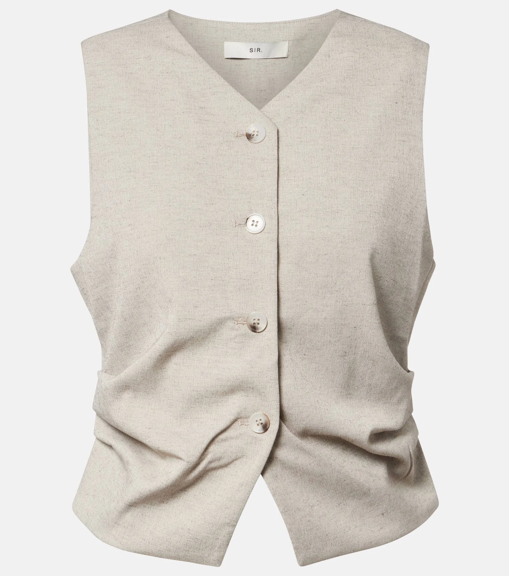 An acronym for “separates, intimates, and ready-to-wear”, SIR sets the standard for easy-to-wear wardrobe staples. The Leone draped vest is crafted from a lightweight material and is finished with tonal buttons. Product Details - Material: 60% polyester, 20% fabric, 14% cotton, 6% linen - Care instructions: dry clean - Handmade in China - Designer color name: Natural - Item color: beige - Lining: 100% rayon - Closure: buttoned front - Item number: P01074253 Size & Fit - True to size - Cinched waist - Non-stretchy fabric - Slightly cropped - The model seen in the picture is 178cm-5'10" and wearing a size 1