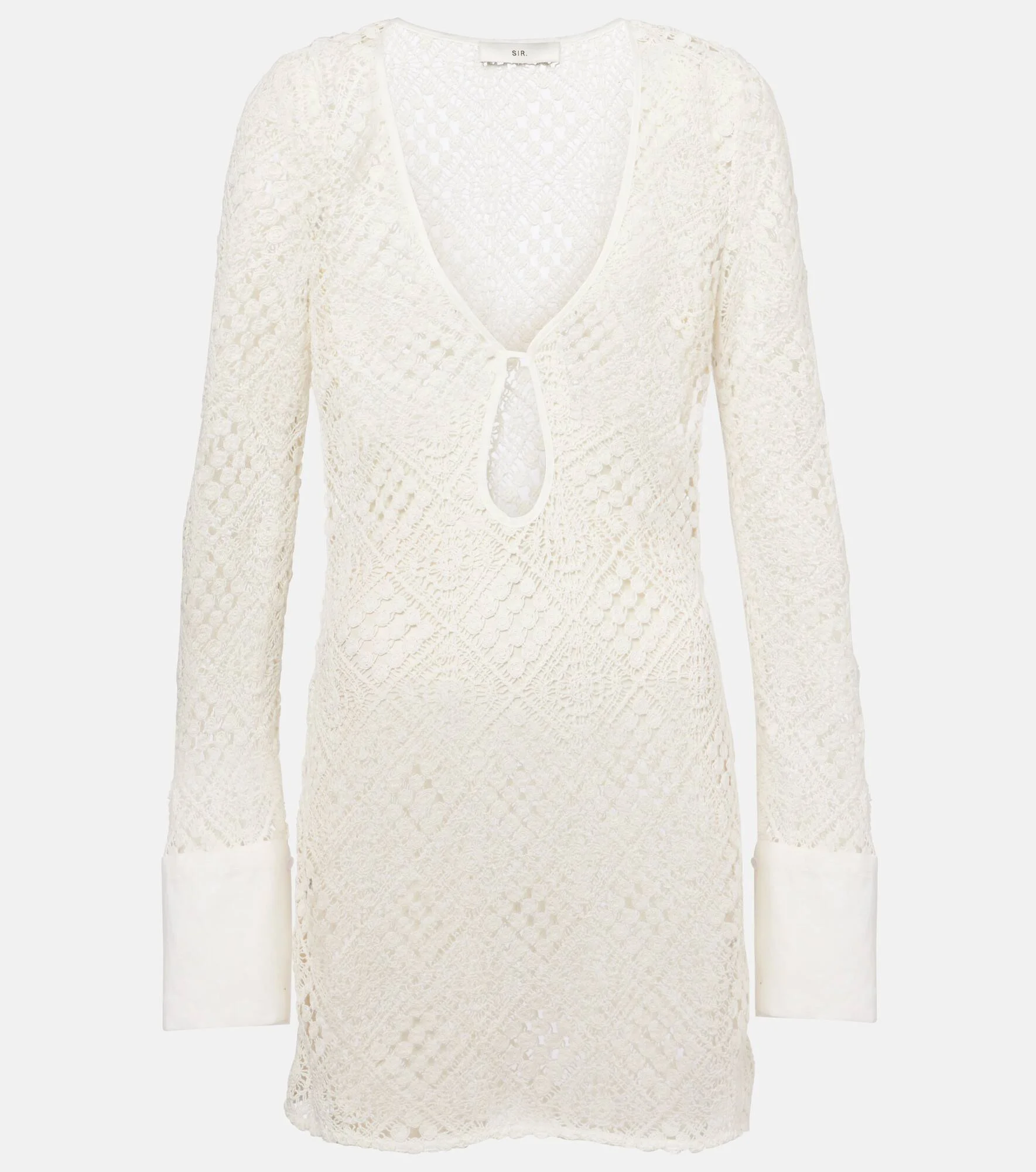 Greet the sunshine with the Rayure breezy cotton minidress from SIR. The hand-crocheted design has a plunging neckline with a keyhole cutout and poplin cuffs at the ends of the sleeves for extra detail. Product Details - Material: 95% cotton, 5% nylon - Care instructions: dry clean - Made in China - Designer color name: Ivory - Item color: beige - Material II: 100% linen - Item number: P01041704 Size & Fit - True to size - Sheer - Cinched waist - Non-stretchy fabric - The model seen in the picture is 178cm-5'10" and wearing a size 1