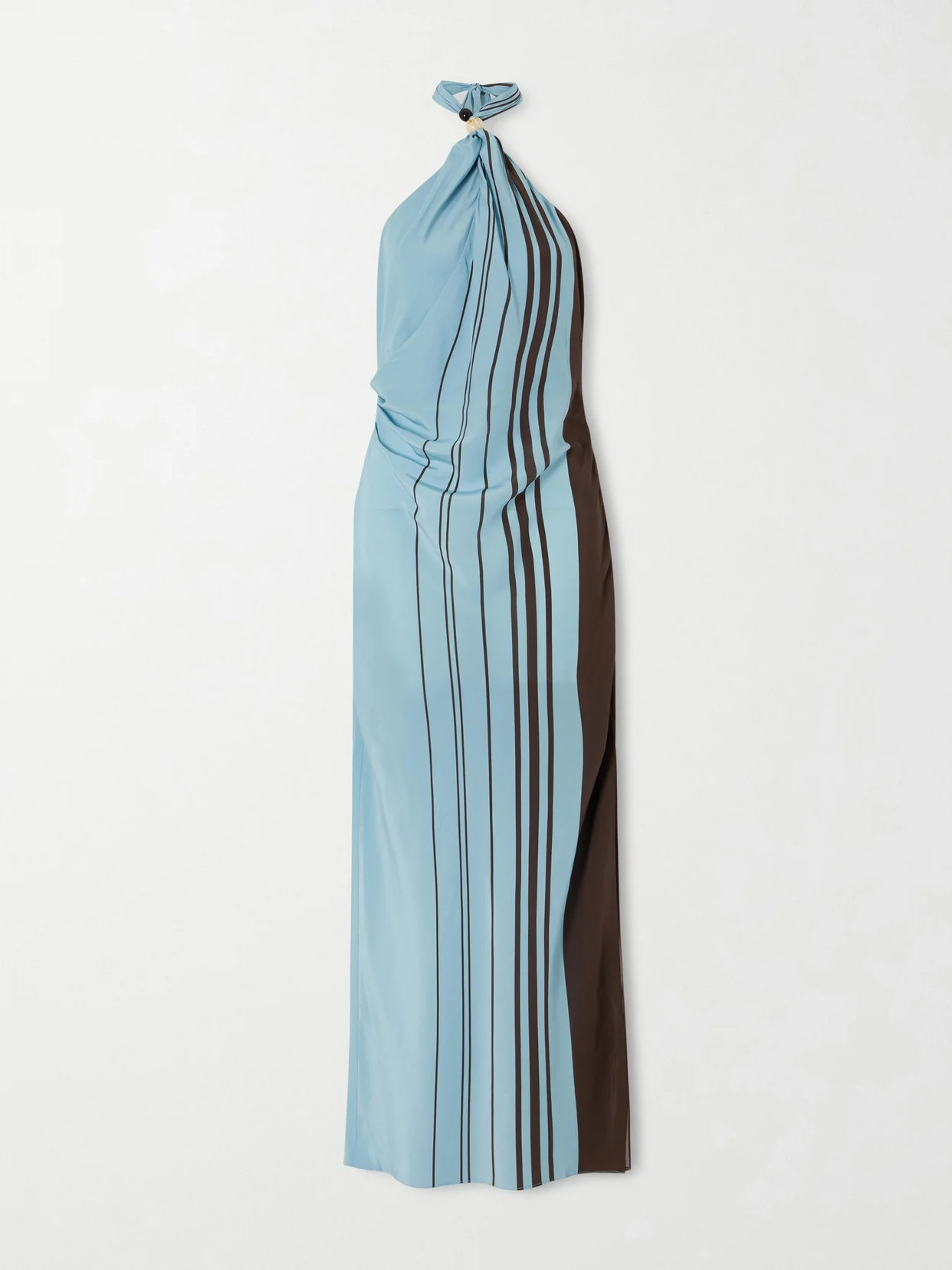SIR.'s 'Rioja' dress is cut from fluid silk-crepe in the brand's signature 'Pacha Mineral Stone' shade and printed with elongating vertical stripes. The halterneck design features a removable bead, allowing you to switch between a classic high neckline and a plunging V. For a nod to Y2K, cinch it with a wide belt.