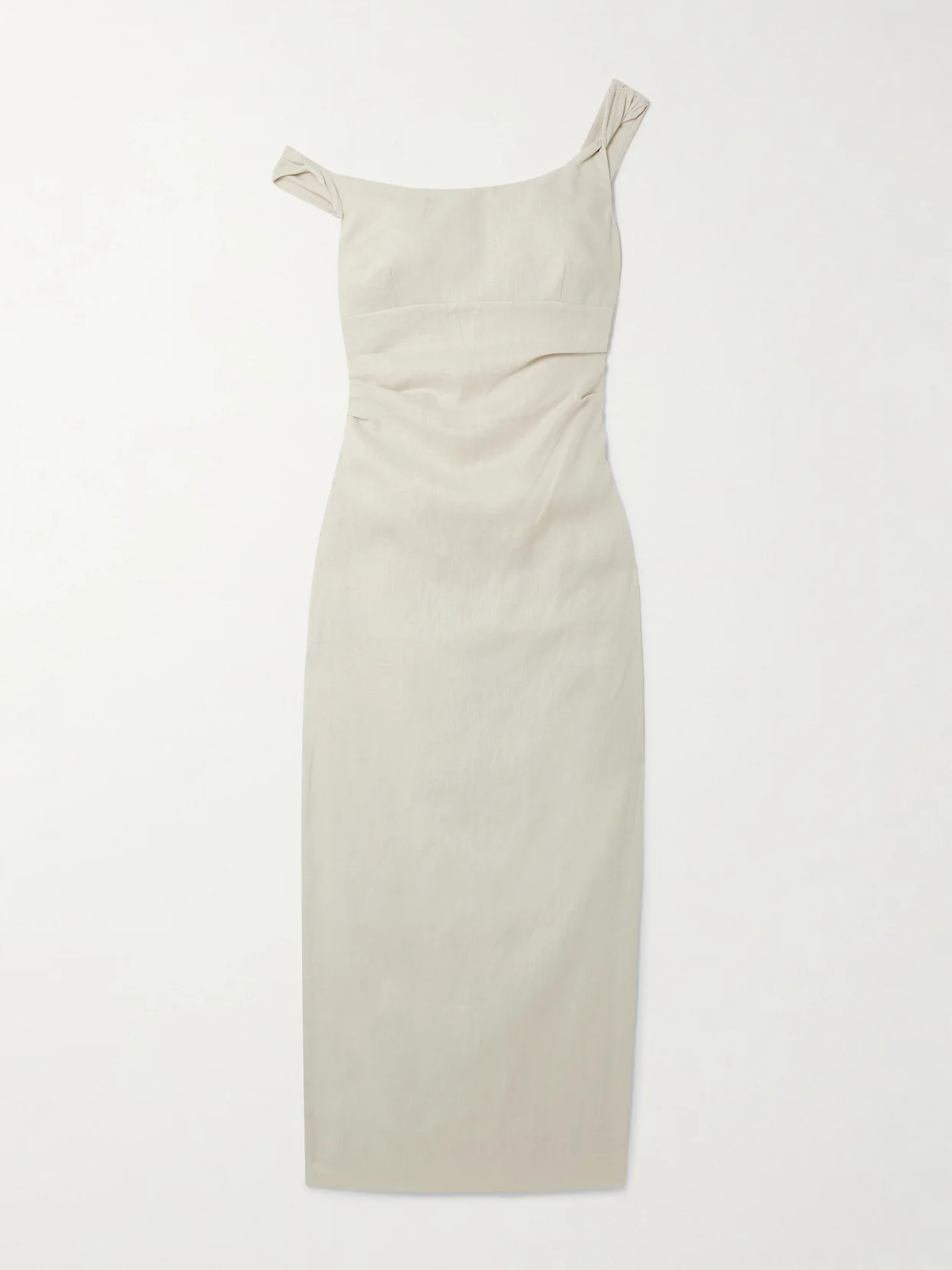 EXCLUSIVE AT NET-A-PORTER. SIR's midi dress has twisted, asymmetric straps and gentle ruching through the waist to enhance its simple yet far from plain design. It's made from breathable linen for a slim fit and looks chic styled with slides or sandals.