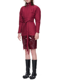 SITUATIONIST jacket in burgundy, stand collar, zip closure, tie fastening, slight ballon sleeves, zip cuffs, cinched waist, slim fit. Italian Sizing Model is 5'9" wearing size 36. Bust: 33" Waist: 24" Hip: 33"
