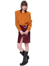 SITUATIONIST sweater in orange, slight v-neck collar, padded shoulders, wide body, integrated sleeves, relaxed fit. French Sizing Model is 5'9" wearing size 34. Bust: 33" Waist: 24" Hip: 33"