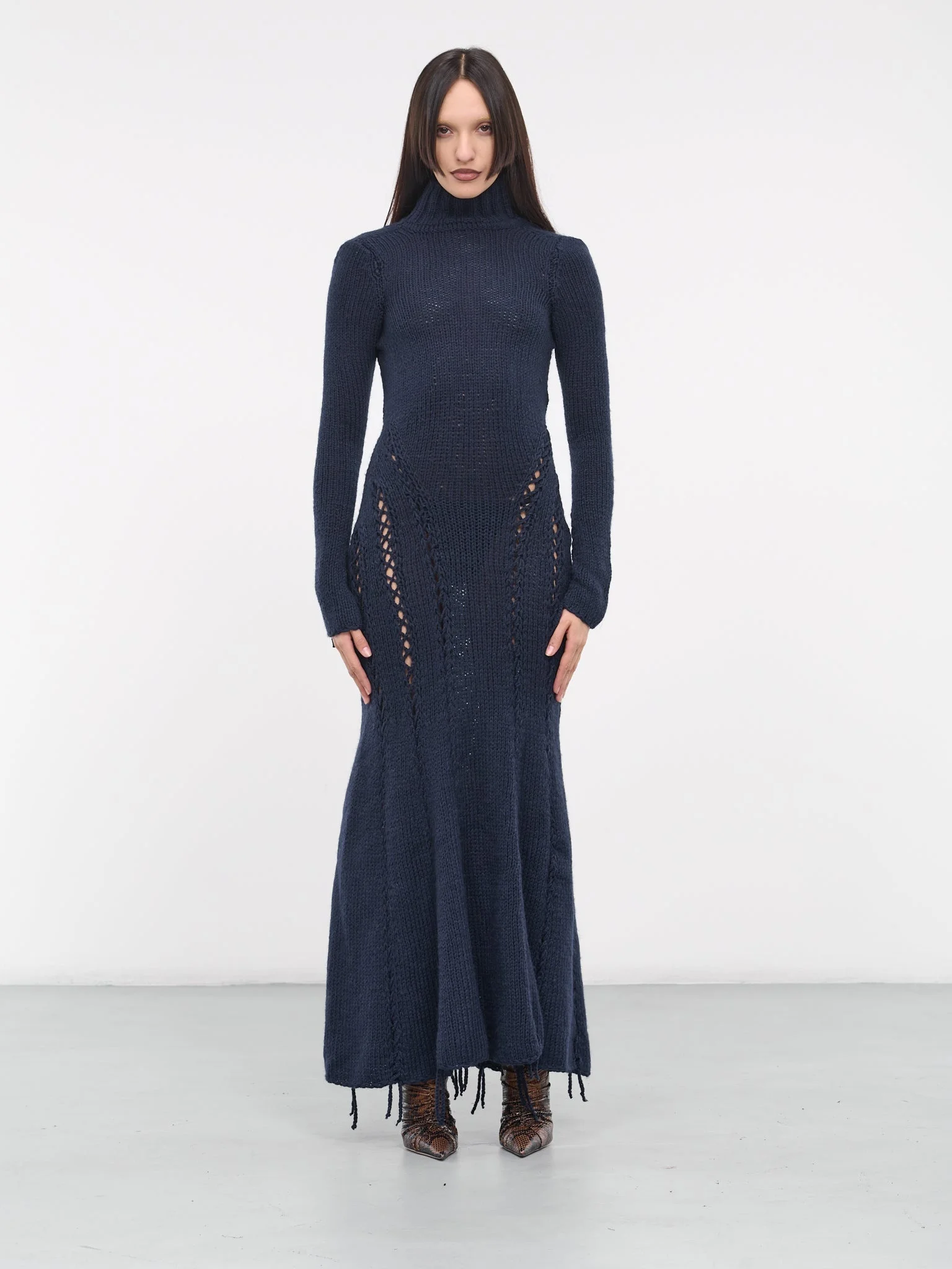 YASPIS x SITUATIONIST dress in navy, hand-knit cotton construction, ribbed turtleneck, open back, long sleeves, cut-outs, lace-up detailing, ruffled hem, extended trim, maxi-length, slim fit. Made in Georgia French Sizing Model is 5'8" wearing size 34. Bust: 32" Waist: 26" Hips: 34.5"