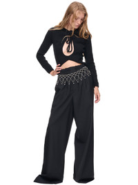 SITUATIONIST sweater in black, hand knit construction, round neckline with tie closure, center cut-out detail, long sleeves, front triangle hem, slim-fit. Made in Georgia Italian Sizing 80% Wool, 20% Polyester Model is 5'9" wearing size 36. Bust: 32" Waist: 24" Hip: 34"