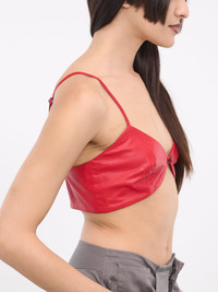 YASPIS x SITUATIONIST red bra, paneled leather construction, v-neckline, sleeveless, spaghetti straps, front hook & eye fastening, back exposed zip closure, silver-tone hardware, dipped hem, cropped length, fitted. Made in Georgia French Sizing Model is 5'8" wearing size 36. Bust: 32" Waist: 26" Hips: 34.5"
