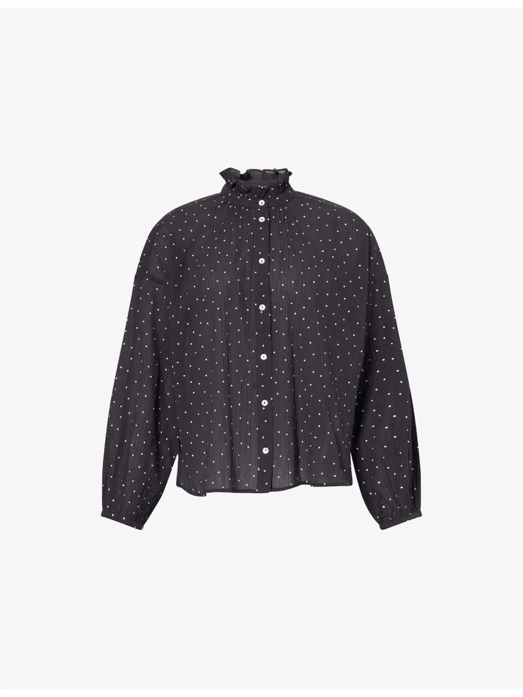PRODUCT DETAILS - SKALL STUDIO cotton-poplin shirt - 100% cotton - Exposed button fastening at front - Band collar - Buttoned cuffs - Relaxed fit, frilled collar, long sleeves, all-over polka dot print, all-over wrinkled texture, split at sides, curved hem - Machine wash at 30°C - Made in India - True to size - Size UK 8: length 24in / 61cm - Model is 5ft 10in/1.78m and wears a size UK 8 - Lightweight, stretchy Ref: R04556546