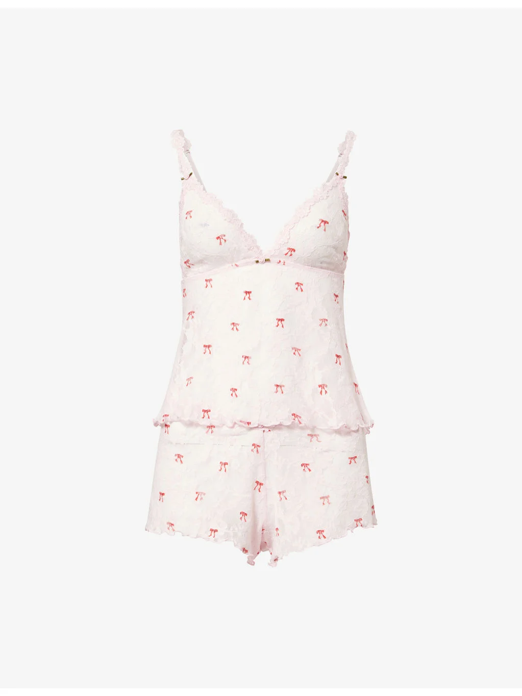 PRODUCT DETAILS - SKIMS lace pyjama set - 100% polyamide - Top: regular fit, v-neck, adjustable shoulder straps, all-over bow pattern, floral lace, semi sheer - Bottoms: regular fit, elasticated waistband, all-over bow pattern, floral lace, semi sheer - Machine wash cold - True to size - Model is 5ft 10in/1.78m and wears a size small - Lightweight, slight stretch Ref: R04538127