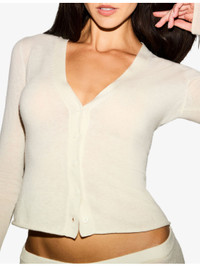 PRODUCT DETAILS - SKIMS cashmere cardigan - 100% cashmere - Exposed button fastening at front - Slim fit, V-neck, long sleeves, fine-knit texture, grade A cashmere - Hand wash - True to size - Model is 5ft 10in/1.78m and wears a size small - Lightweight, non-stretch Ref: R04538133