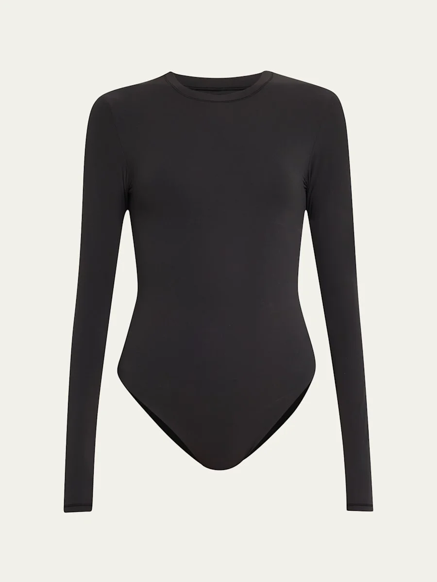 SKIMS bodysuit in stretchy and breathable Fits Everybody fabric Crew neckline Long sleeves High-cut leg openings Minimal seat coverage Formfitting Cotton-lined snap gusset Nylon/polyamide/elastane Imported Proposition 65 warning for California residents Model is 5'10"/177cm. Online Inquiries: BGS21_I2LVE| Store Inquiries: #4882869