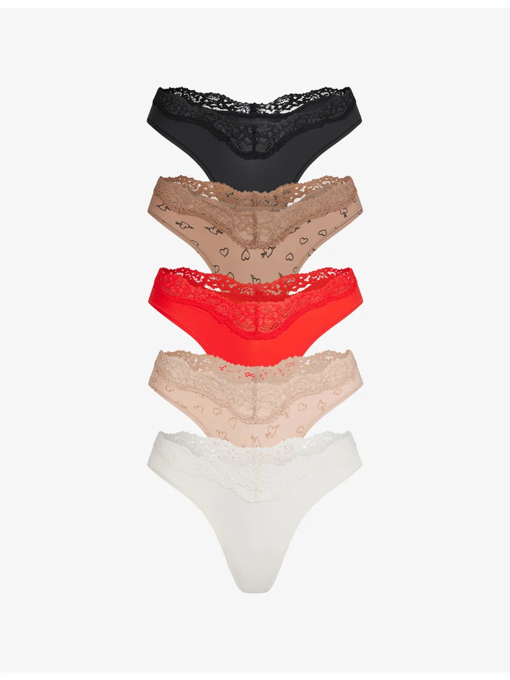 PRODUCT DETAILS - SKIMS jersey thongs pack of five - 76% polyamide, 24% elastane - Pack of five, low-rise, elasticated waistband, lace trim, minimal coverage, high-cut leg, multiple designs - Machine wash cold - True to size - Lightweight, stretchy - For hygiene reasons, we are unable to exchange or refund this product, unless faulty. Ref: R04572164
