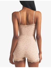 PRODUCT DETAILS - SKIMS jersey onesie - 76% polyamide, 24% elastane - Fitted, scoop neckline, adjustable shoulder straps, lace trims, all-over heart print, jersey texture - Machine wash cold - True to size - Lightweight, stretchy Ref: R04572154