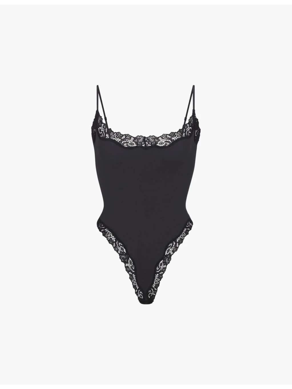 PRODUCT DETAILS - SKIMS stretch-woven body - 76% polyamide, 24% elastane - Slips on - Close fitting, scoop neckline, adjustable shoulder straps, lace trim at neckline and leg opening, lined gusset with snap closure - Machine wash mild - True to size - Midweight, stretchy Ref: R04247355