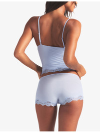 PRODUCT DETAILS - SKIMS stretch-woven cami top and boy short set - 76% polyamide, 24% elastane - Cami top: V-neck, triangle shape, adjustable straps, lace trims - Boy Shorts: mid rise, elasticated waist, lace trims, full rear coverage - Machine wash cold - True to size - Lightweight, stretchy Ref: R04538128