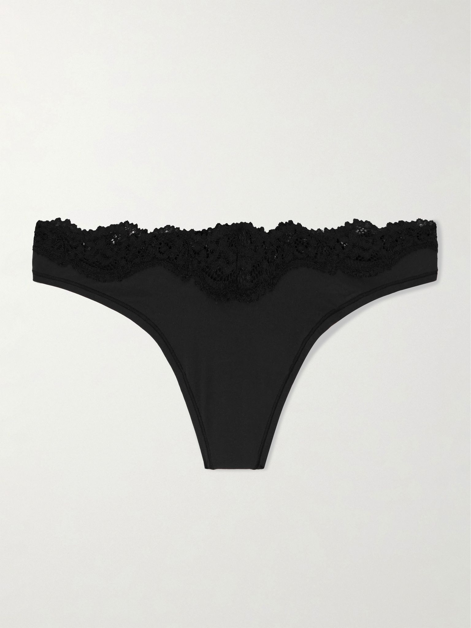 SKIMS' 'Fits Everybody' thong has a dipped front that ensures it'll stay invisible under low-rise pants. It's made from butter-soft stretch-jersey and trimmed with tonal lace. Make it a set with the coordinating bra. Size & Fit - Fits true to size, take your normal size - Mid-rise briefs with minimal coverage - Model is 175cm/ 5'9" and is wearing a size Small Details & Care - Onyx stretch-jersey and lace - Lined at base - 76% polyamide, 24% elastane; lining: 100% cotton - Machine wash